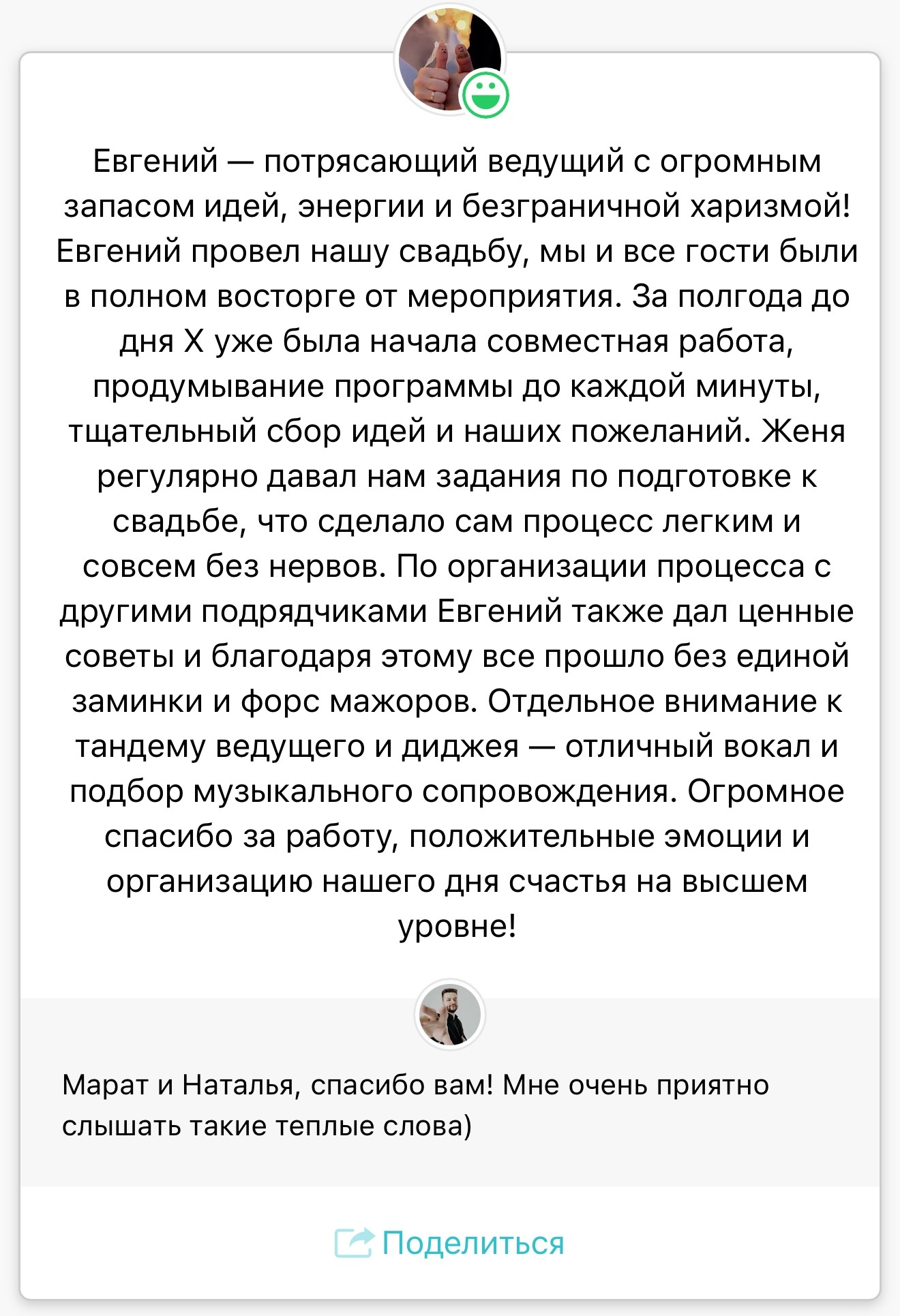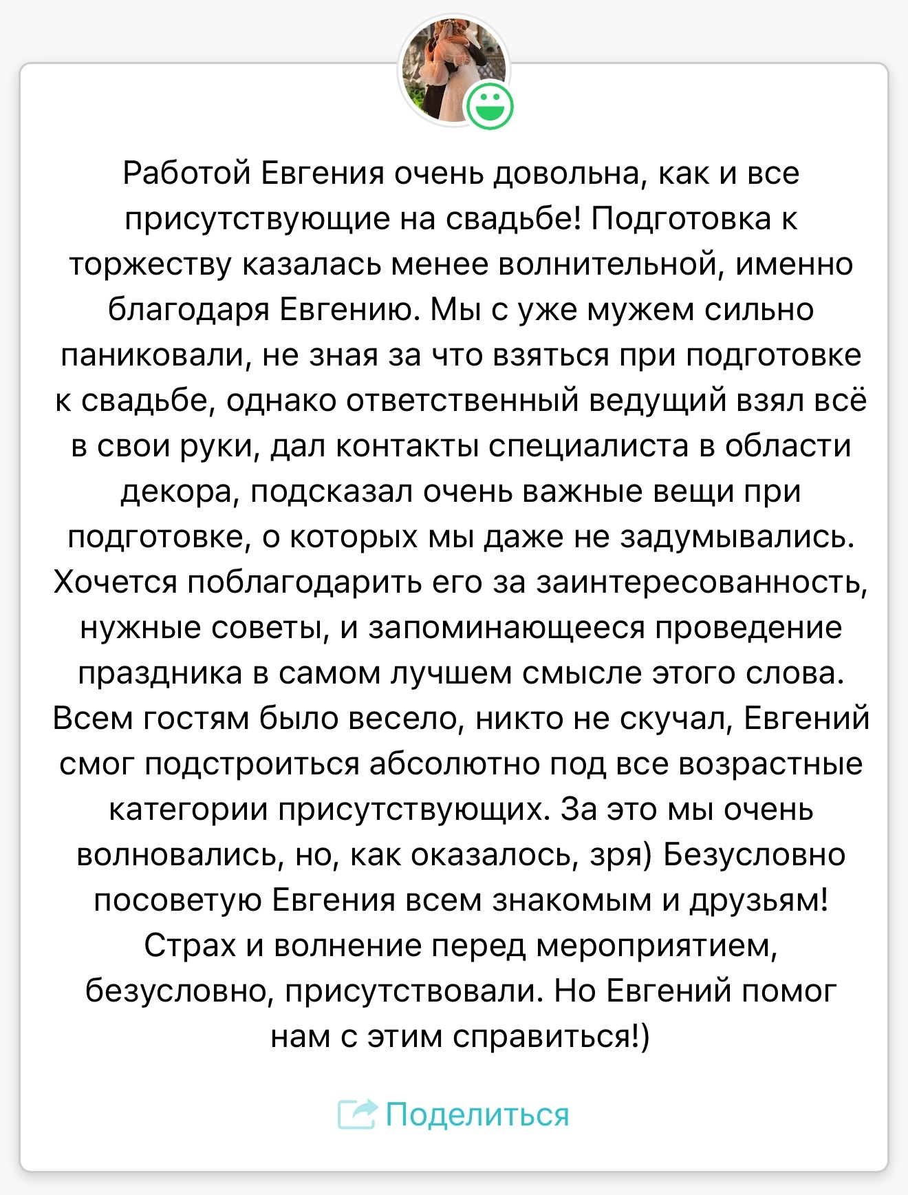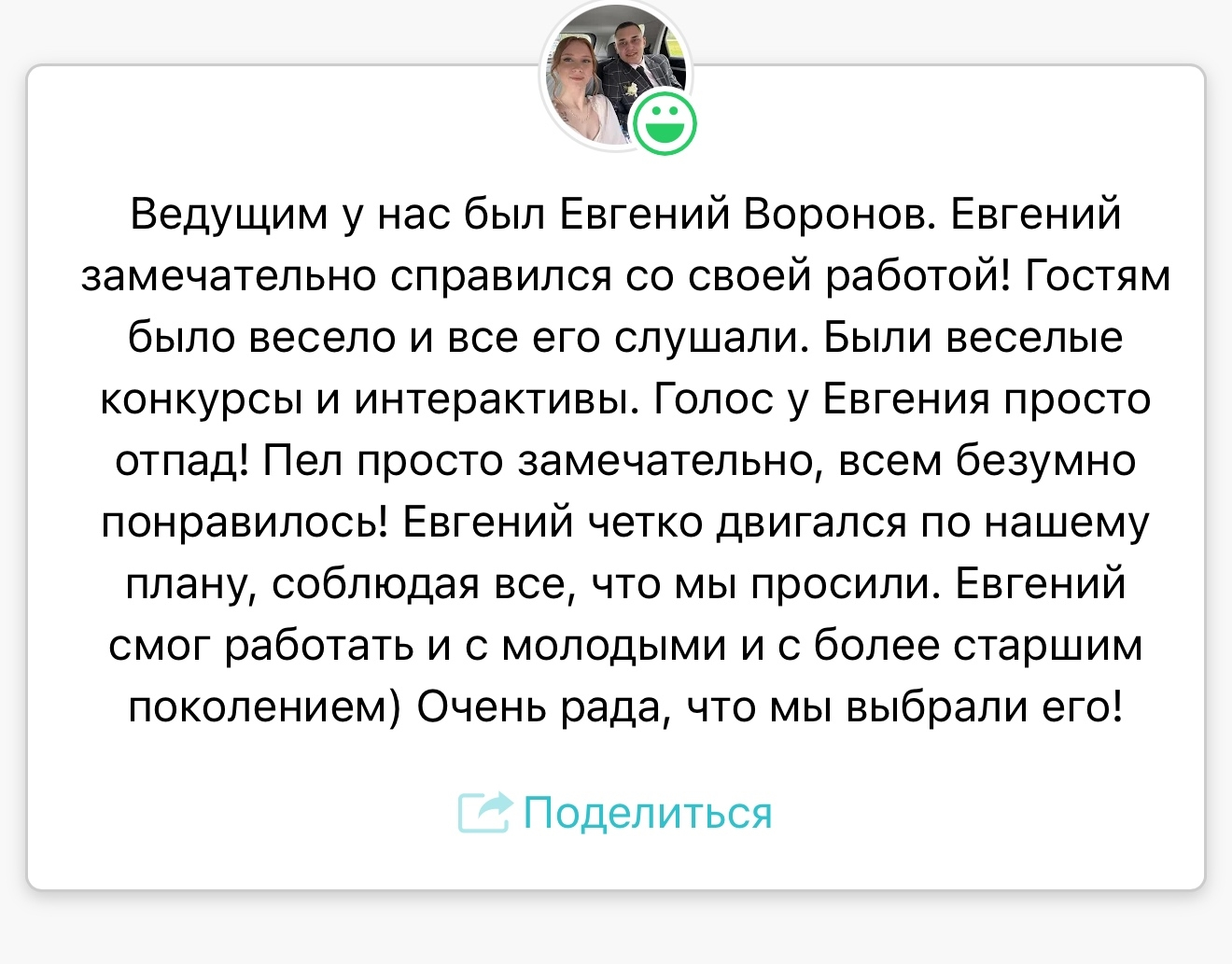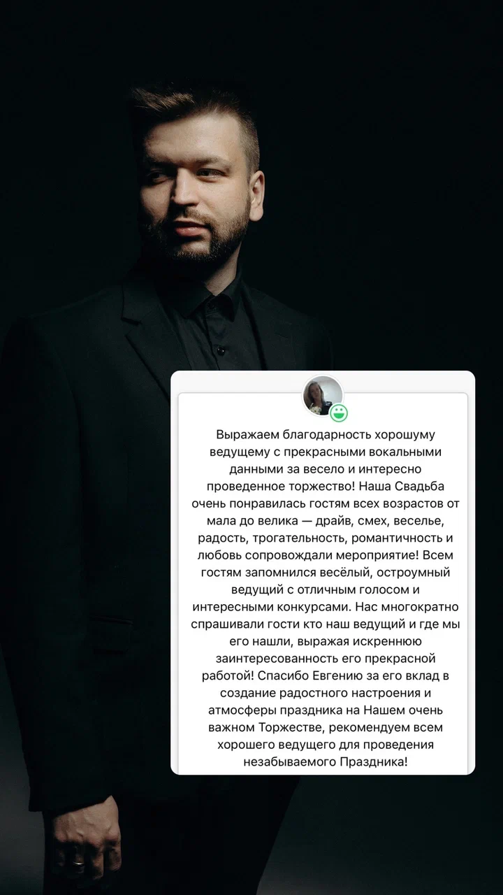 Легко нахожу общий язык с любыми гостями. Каждый раз, когда я выхожу на сцену, я стремлюсь создать атмосферу уюта и веселья, чтобы каждая свадьба была неповторимой!