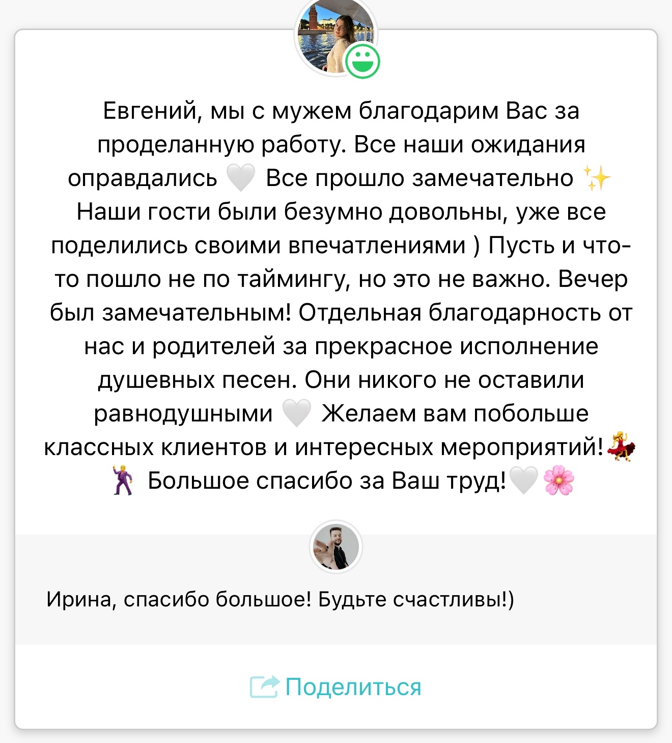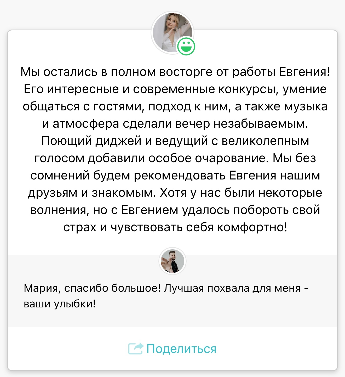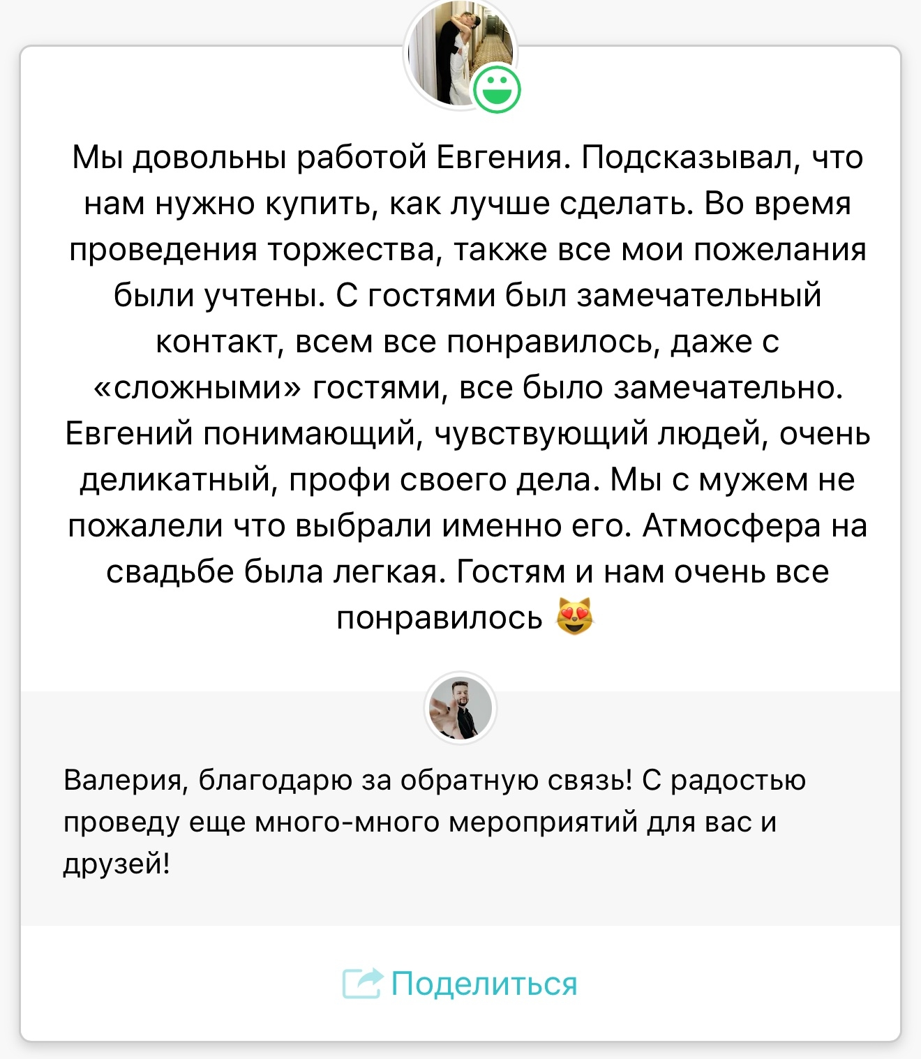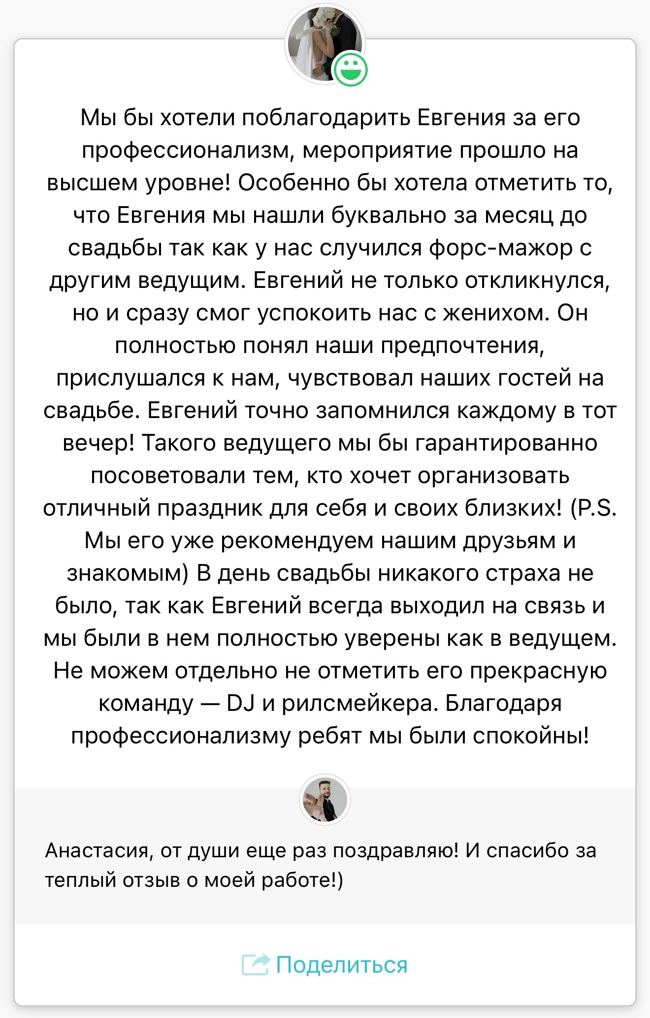 Легко нахожу общий язык с любыми гостями. Каждый раз, когда я выхожу на сцену, я стремлюсь создать атмосферу уюта и веселья, чтобы каждая свадьба была неповторимой!